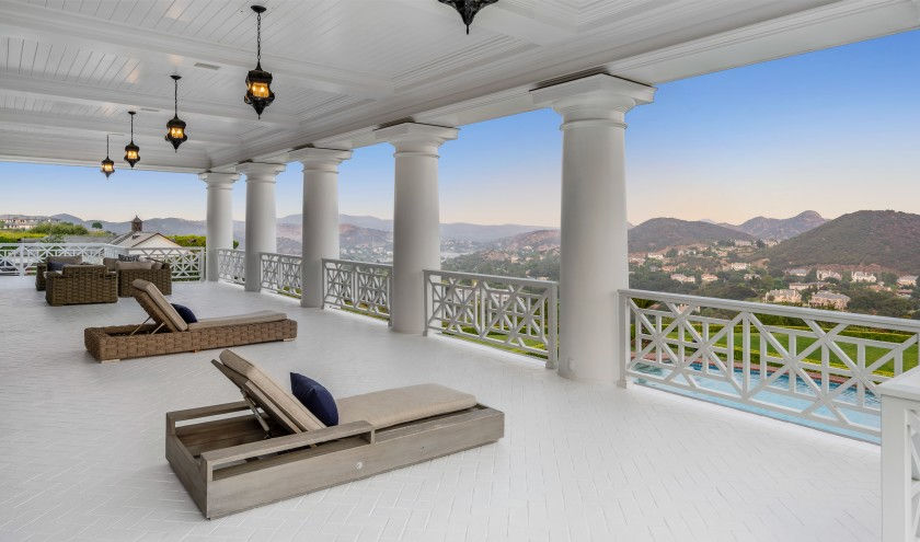 The beautiful and large patio with the stunning view's of the Santa Monica Mountains. Overlooking the swimming pool & spa.